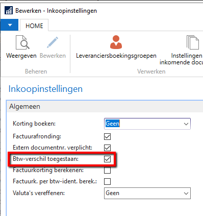 Ga naar Inkoopinstellingen en zet in het sneltabblad "Algemeen" het vinkje aan bij: "BTW-verschil toegestaan"